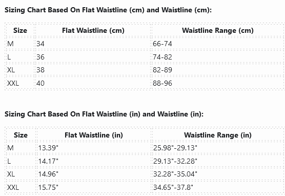 Sizing Chart Based On Flat Waistline (cm) and Waistline (cm):