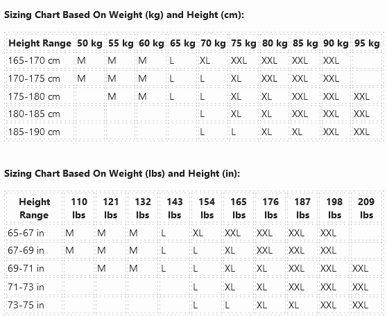 | 165-170 cm | M | M | M | L | XL | XXL | XXL | XXL | XXL | |