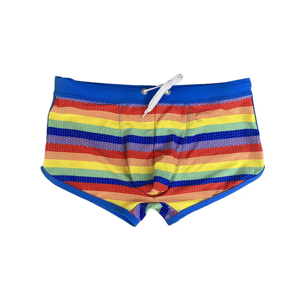 But it's not all about looks. Crafted from a blend of nylon, spandex, and polyester, our Rainbow Square Cut Swim Trunks offer both stretch and comfort. They're designed to fit snugly, highlighting your figure while providing the freedom to move, dance, and swim with ease. Whether you're voguing by the pool or diving into the ocean, these trunks will stay put and look great.