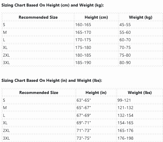 Sizing Chart Based On Height (cm) and Weight (kg):