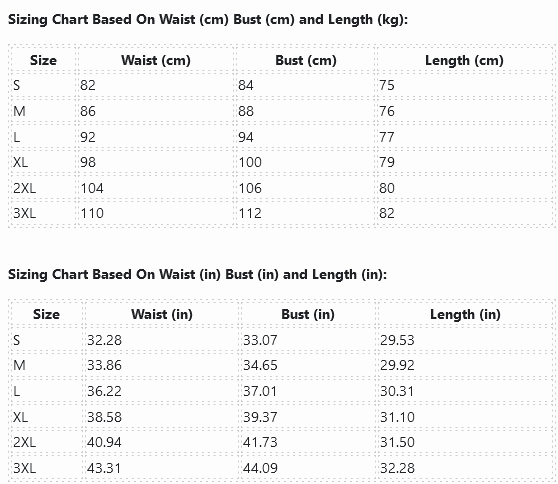 Sizing Chart Based On Waist (in) Bust (in) and Length (in):