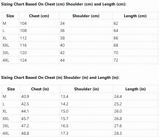 | Size | Chest (cm) | Shoulder (cm) | Length (cm) |