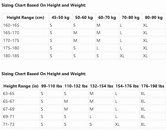 Sizing Chart Based On Height and Weight: