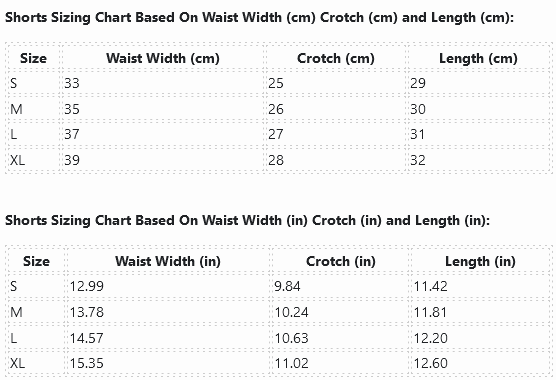 Shorts Sizing Chart Based On Waist Width (cm) Crotch (cm) and Length (cm):