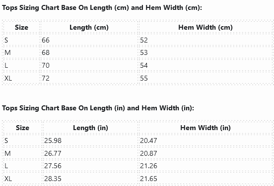 Tops Sizing Chart Base On Length (cm) and Hem Width (cm):