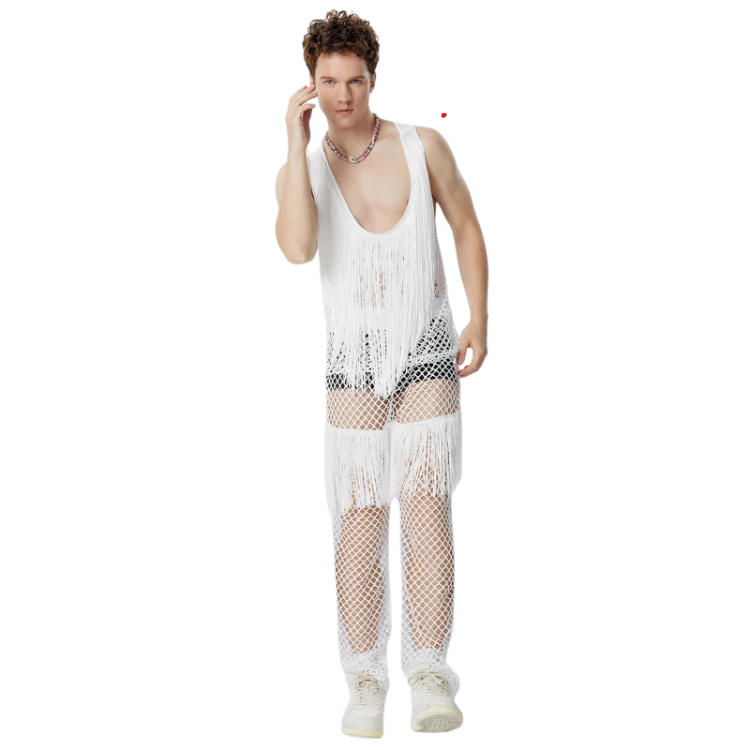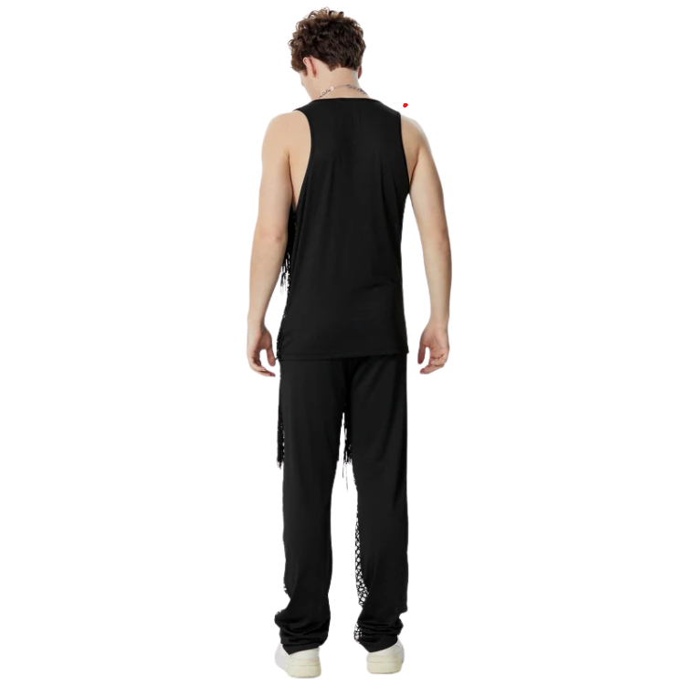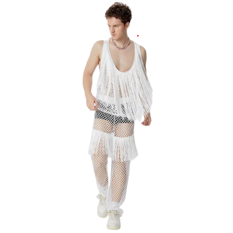 Step out and slay in the Tassel Mesh Sleeveless Tank Top + Pants—a duo that's here not just to participate but to take over the spotlight! Designed for the bold and the beautiful in the queer community, this ensemble is a playful nod to those iconic nights at Studio 54, mixed with a dash of contemporary queer aesthetics.