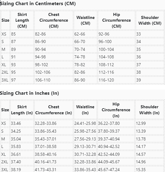 | Size | Skirt Length (In) | Chest Circumference (In) | Waistline (In) | Hip Circumference (In) | Shoulder Width (In) |