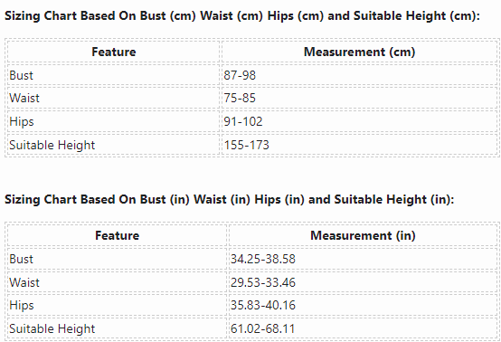 Sizing Chart Based On Bust (in) Waist (in) Hips (in) and Suitable Height (in):