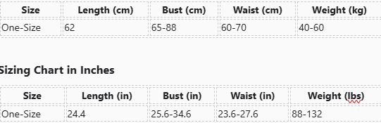 | Size | Length (cm) | Bust (cm) | Waist (cm) | Weight (kg) |
