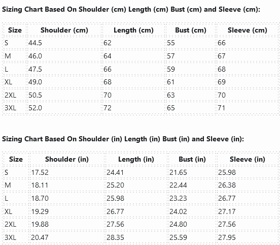 Sizing Chart Based On Shoulder (cm) Length (cm) Bust (cm) and Sleeve (cm):