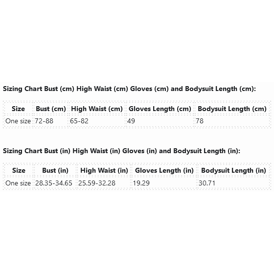 | Size | Bust (cm) | High Waist (cm) | Gloves Length (cm) | Bodysuit Length (cm) |