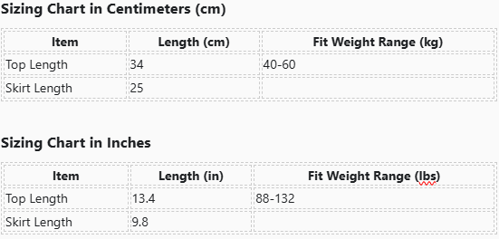 | Item | Length (cm) | Fit Weight Range (kg) |