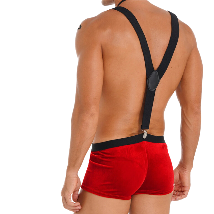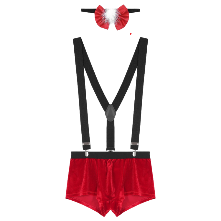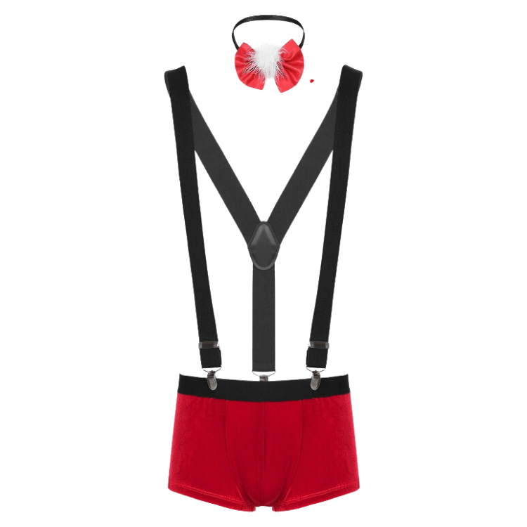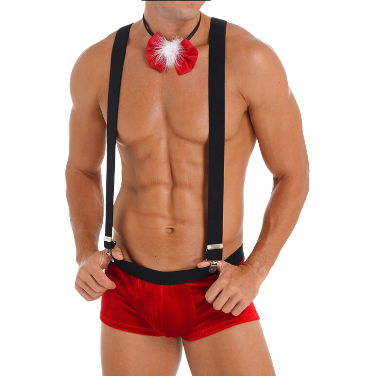 Designed for those who dare to stand out, the suspenders suit boasts a form-fitting silhouette that highlights every curve and contour of your body. Whether you're mingling at a club or hosting a cheeky Christmas soiree, this outfit is your ticket to feeling irresistibly sexy. It's not just a suit; it's a declaration of confidence and self-expression, tailored for the bold spirits within the queer community.