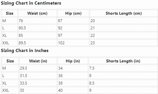 | Size | Waist (cm) | Hip (cm) | Shorts Length (cm) |