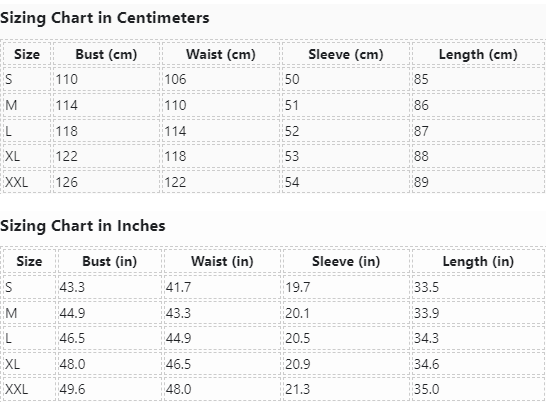 | Size | Bust (cm) | Waist (cm) | Sleeve (cm) | Length (cm) |