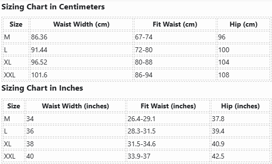 | Size | Waist Width (inches) | Fit Waist (inches) | Hip (inches) |