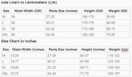 | Size | Waist Width (CM) | Pants Size (Inches) | Height (CM) | Weight (KG) |