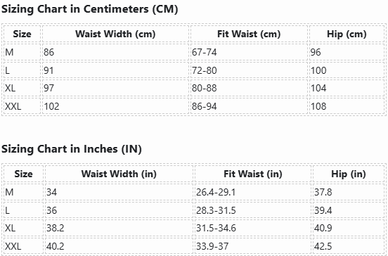 | Size | Waist Width (cm) | Fit Waist (cm) | Hip (cm) |