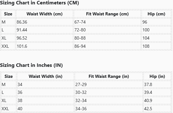 | Size | Waist Width (cm) | Fit Waist Range (cm) | Hip (cm) |