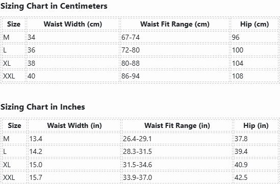 | Size | Waist Width (cm) | Waist Fit Range (cm) | Hip (cm) |