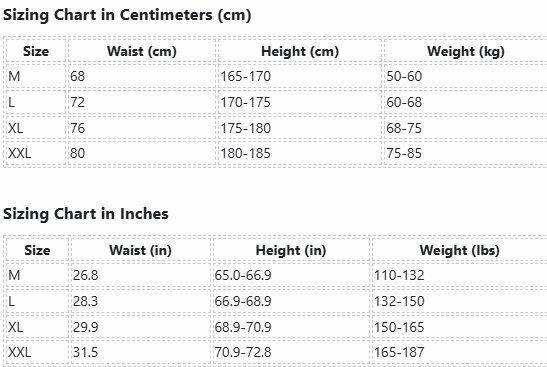 | Size | Waist (cm) | Height (cm) | Weight (kg) |