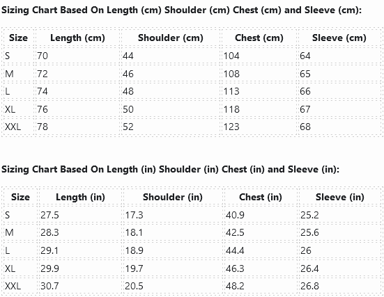 Sizing Chart Based On Length (cm) Shoulder (cm) Chest (cm) and Sleeve (cm):