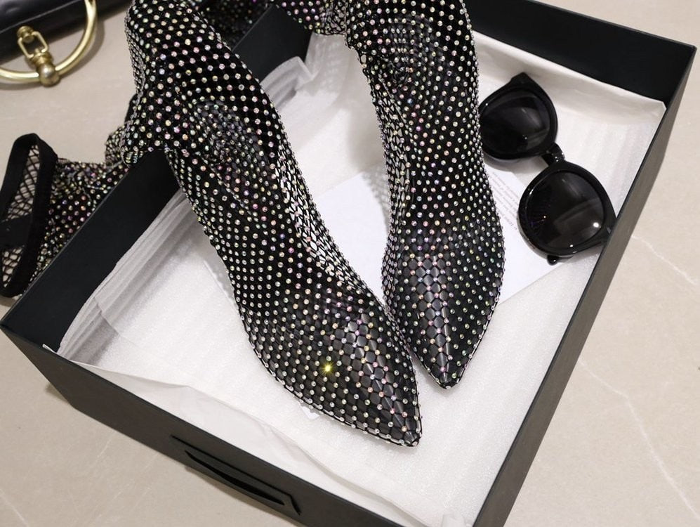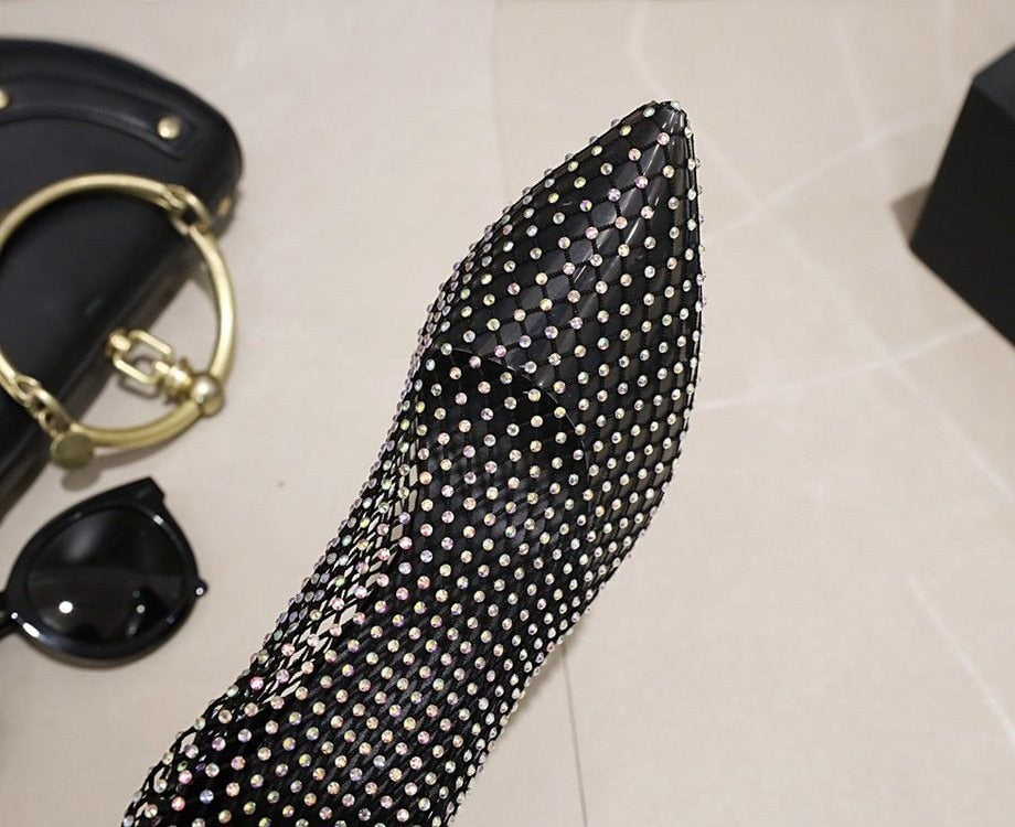 The insole is made from PU, and the outsole is made from rubber from a better grip on the road. These dramatic and sexy heels are adorned with a mesh material that is detailed with crystal embellishment for that perfect amount of glimmer. They give the message of being outrageously stunning and help you unleash your truest self. Put them on with a simple dress or shorts, to focus all attention on them!