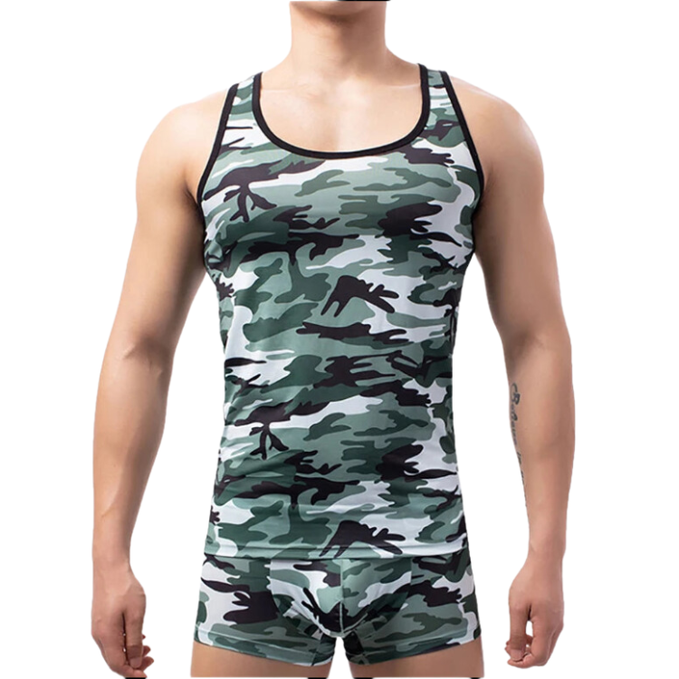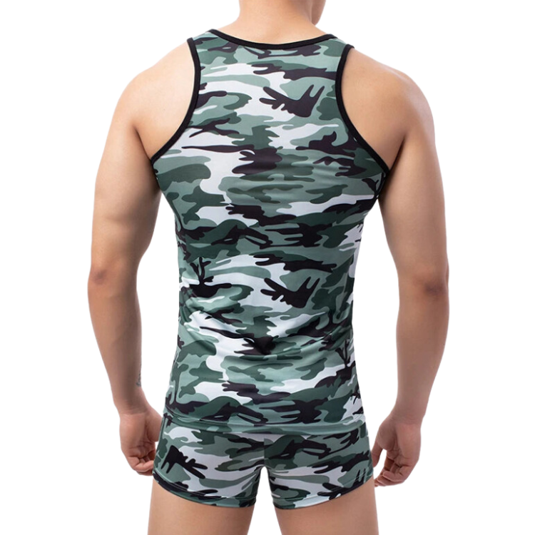 Crafted from smooth, breathable polyester, this set features a tantalizing tank top and fetching fitted shorts, each adorned with a sassy camouflage print that's all about celebrating boldness and individuality. It's not just about looking good (though you’ll look fabulous); it’s about feeling unstoppable. Whether you're hitting the club or strutting at Pride, gear up in this outfit and watch as heads turn and compliments fly.