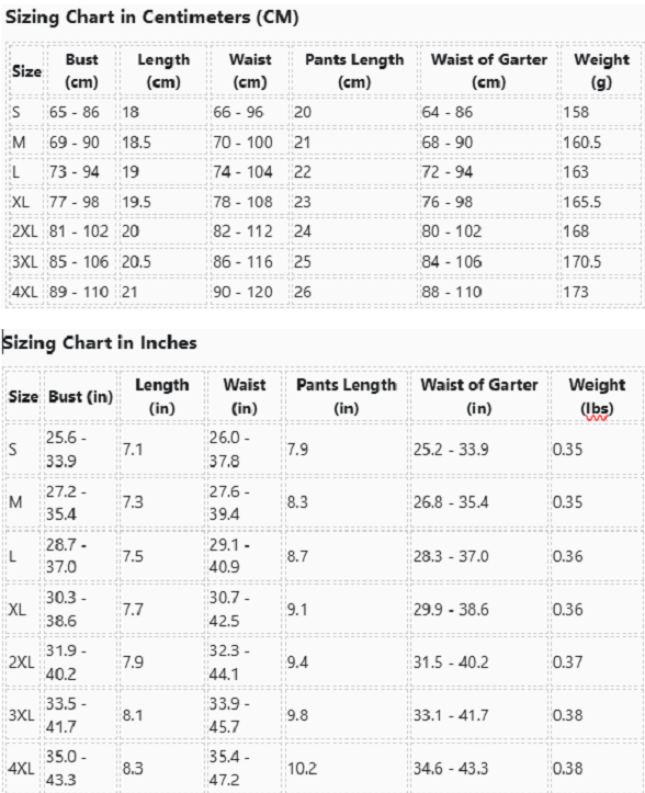 | Size | Bust (in) | Length (in) | Waist (in) | Pants Length (in) | Waist of Garter (in) | Weight (lbs) |