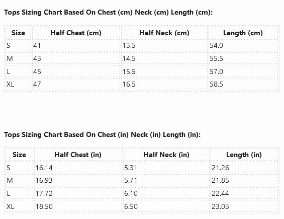 Tops Sizing Chart Based On Chest, Neck and Length in Centimeters: