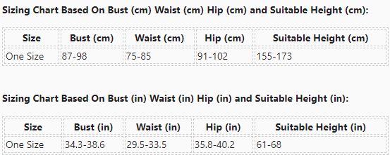 Sizing Chart Based On Bust (in) Waist (in) Hip (in) and Suitable Height (in):