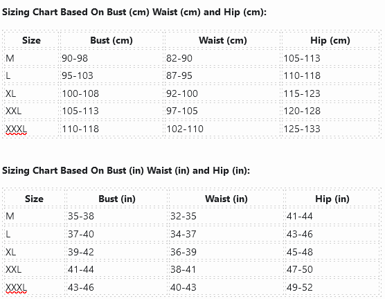Sizing Chart Based On Bust (cm) Waist (cm) and Hip (cm):