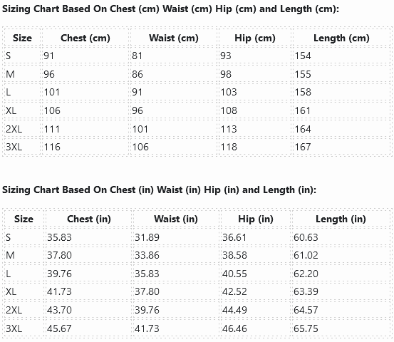 Sizing Chart Based On Chest (in) Waist (in) Hip (in) and Length (in):