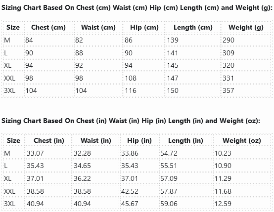 | Size | Chest (cm) | Waist (cm) | Hip (cm) | Length (cm) | Weight (g) |