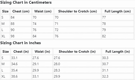 | Size | Chest (cm) | Waist (cm) | Shoulder to Crotch (cm) | Full Length (cm) |