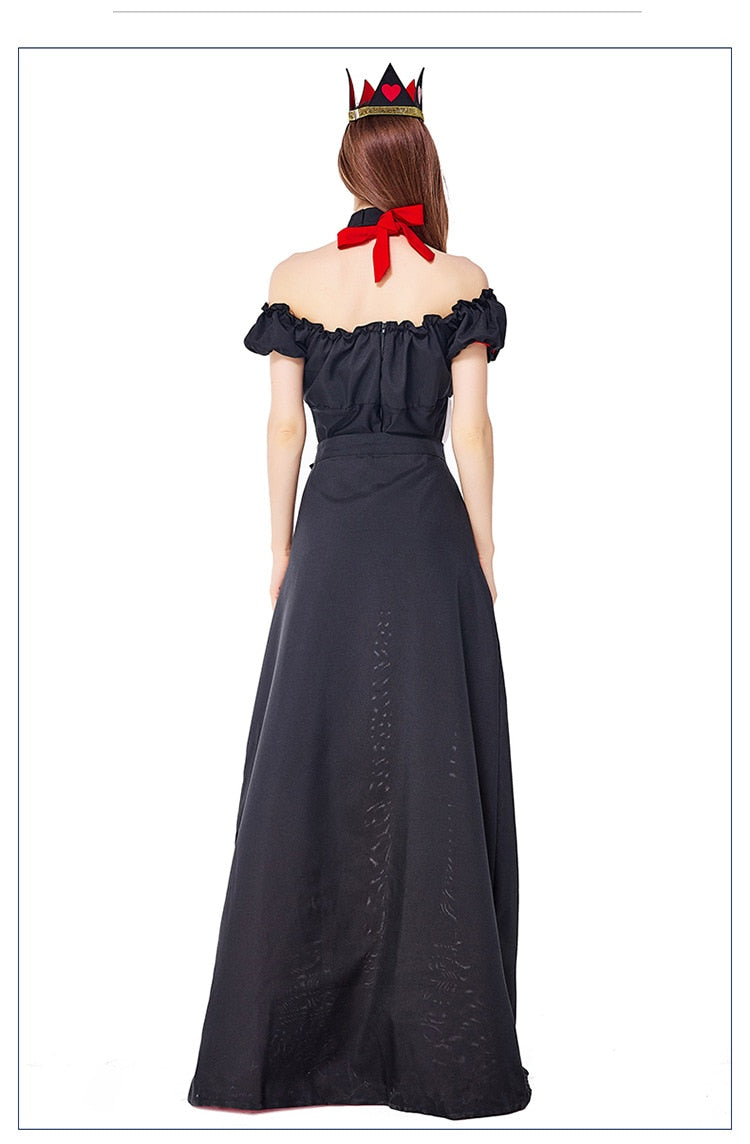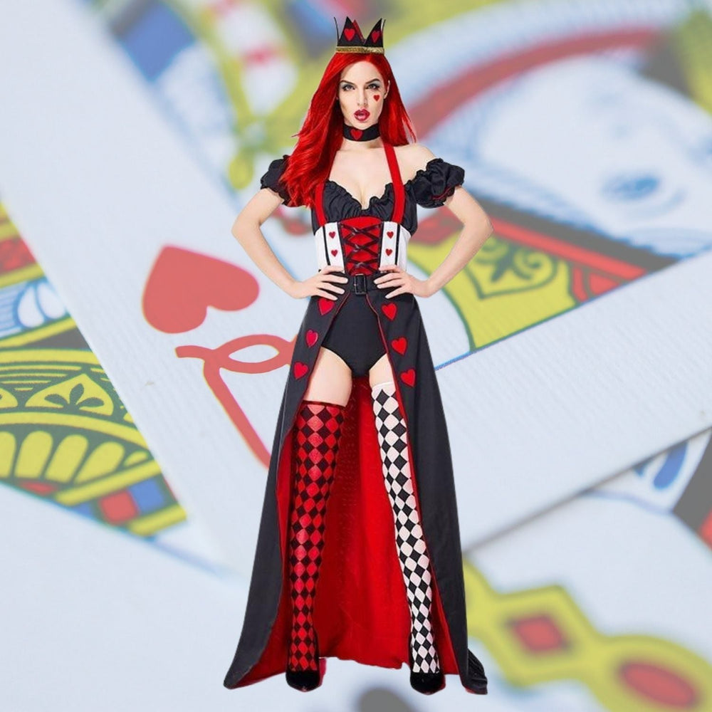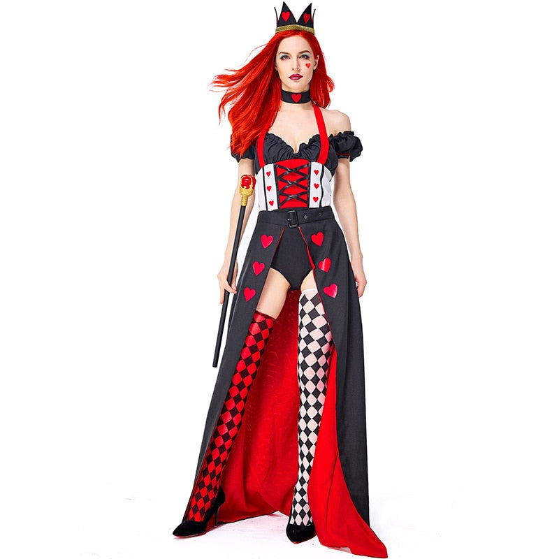 Anyone can be a queen with this unforgettable Sexy Queen Of Hearts Costume. The dark storybook aesthetic is in full force here, with motifs of hearts and harlequins on a stark black dress.