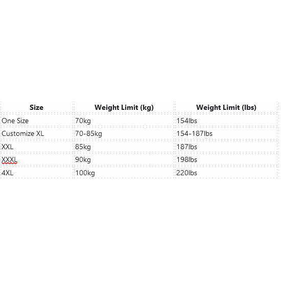 | Customize XL | 70-85kg | 154-187lbs |