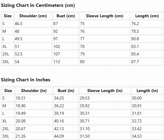 | Size | Shoulder (cm) | Bust (cm) | Sleeve Length (cm) | Length (cm) |