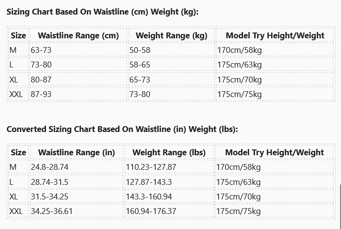 | Size | Waistline Range (cm) | Weight Range (kg) | Model Try Height/Weight |