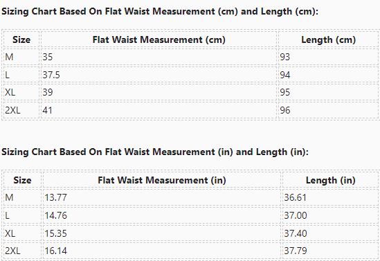 Sizing Chart Based On Flat Waist Measurement (cm) and Length (cm):