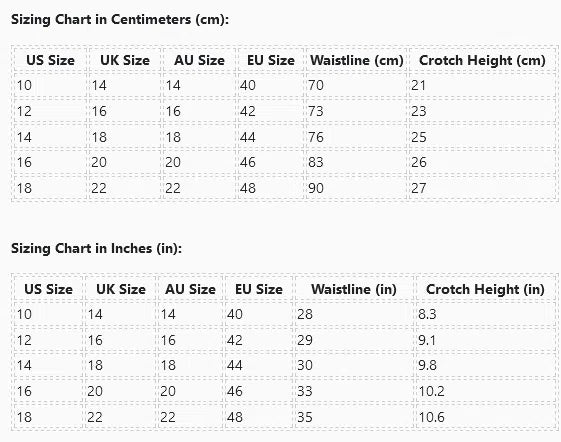 | US Size | UK Size | AU Size | EU Size | Waistline (cm) | Crotch Height (cm) |