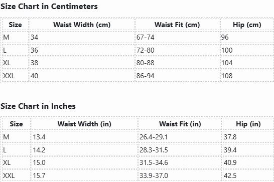 | Size | Waist Width (cm) | Waist Fit (cm) | Hip (cm) |