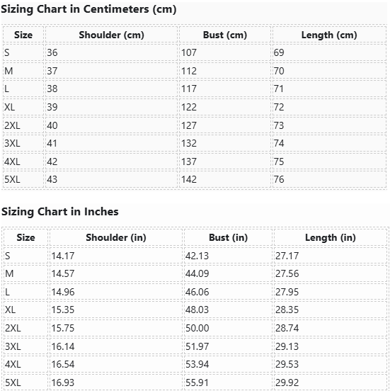 | Size | Shoulder (cm) | Bust (cm) | Length (cm) |