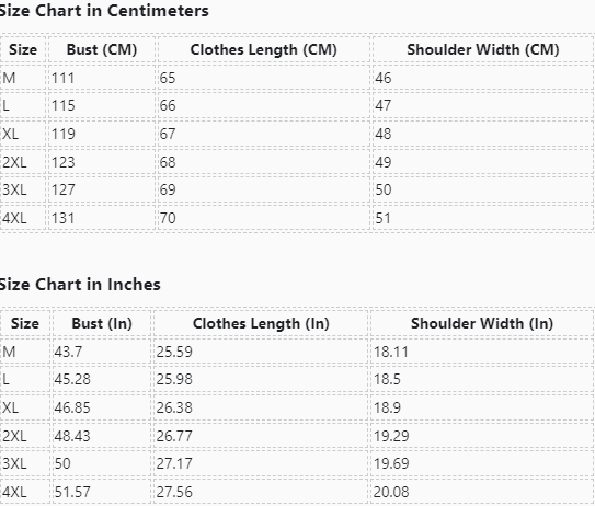 | Size | Bust (CM) | Clothes Length (CM) | Shoulder Width (CM) |