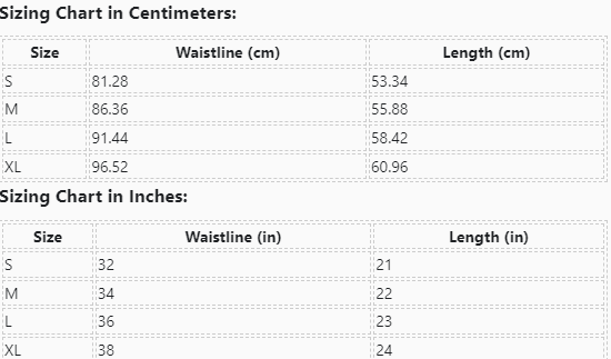 | Size | Waistline (cm) | Length (cm) |