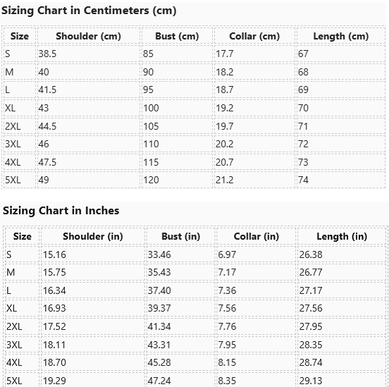 | Size | Shoulder (cm) | Bust (cm) | Collar (cm) | Length (cm) |