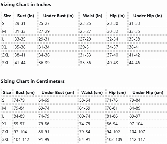 | Size | Bust (in) | Under Bust (in) | Waist (in) | Hip (in) | Under Hip (in) |