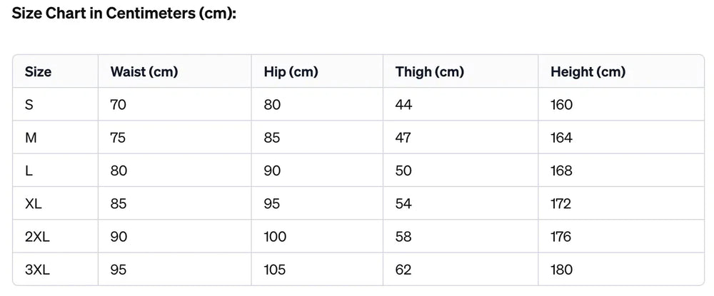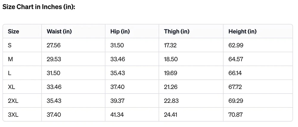 | Size | Waist (in) | Hip (in) | Thigh (in) | Height (in) |