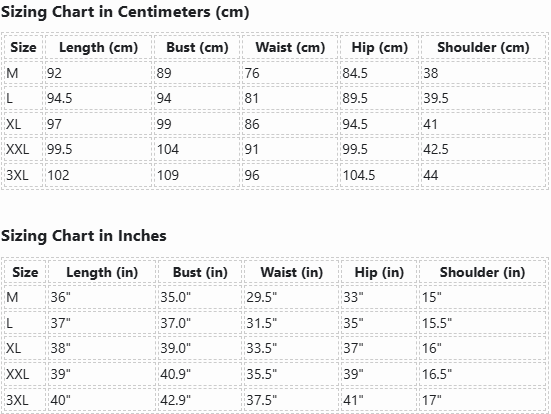 | Size | Length (cm) | Bust (cm) | Waist (cm) | Hip (cm) | Shoulder (cm) |