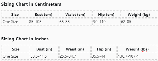 | Size | Bust (in) | Waist (in) | Hip (in) | Weight (lbs) |